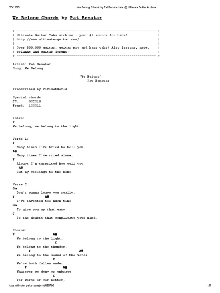 We Belong Chords By Pat Benatar Tabs Ultimate Guitar Archive Song Structure Songs - Standard e a d g b e verse1:
