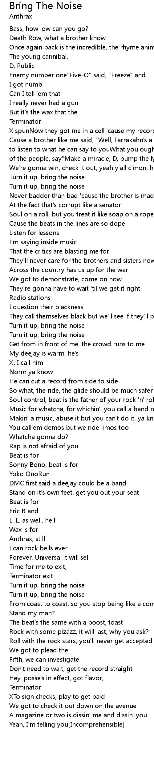 Bring The Noise Lyrics Follow Lyrics - Know what this song is about?